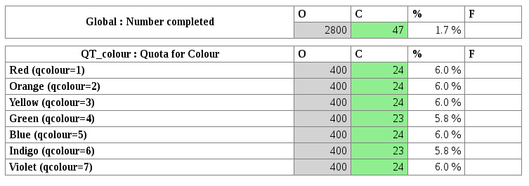 The example program below asks question colour and displays 4 colours from the full list of 7 colours. At the end of the survey each colour to be displayed the same number of times. The quota is satisfied when each colour has been displayed 100 times. Towards the end of the survey fewer than 4 colours will be displayed as quotas are filled.